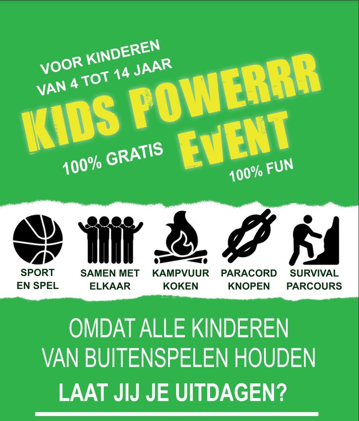 Het Kids Powerrr Event is de open dag van onze groep, waar dan van alles te beleven is. Van iets roosteren boven het kampvuur tot klimmen en klauteren, iets creatiefs of in de natuur bezig zijn. Op deze dag is er voor iedereen wel wat te doen.
