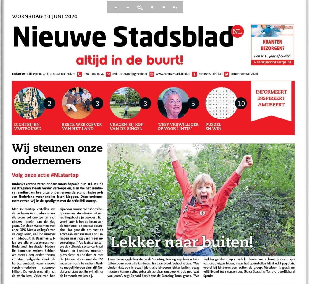 De Scouting Tono-groep levert een maatschappelijke bijdrage door al haar activiteiten open te stellen voor alle kinderen tot 1 september. Na 1 september kijkt de scoutinggroep welke maatregelen in verband met de Corona-pandemie van kracht zijn en of we de actie moeten verlengen. Het Nieuwe Stadsblad bracht het nieuws op de voorpagina.