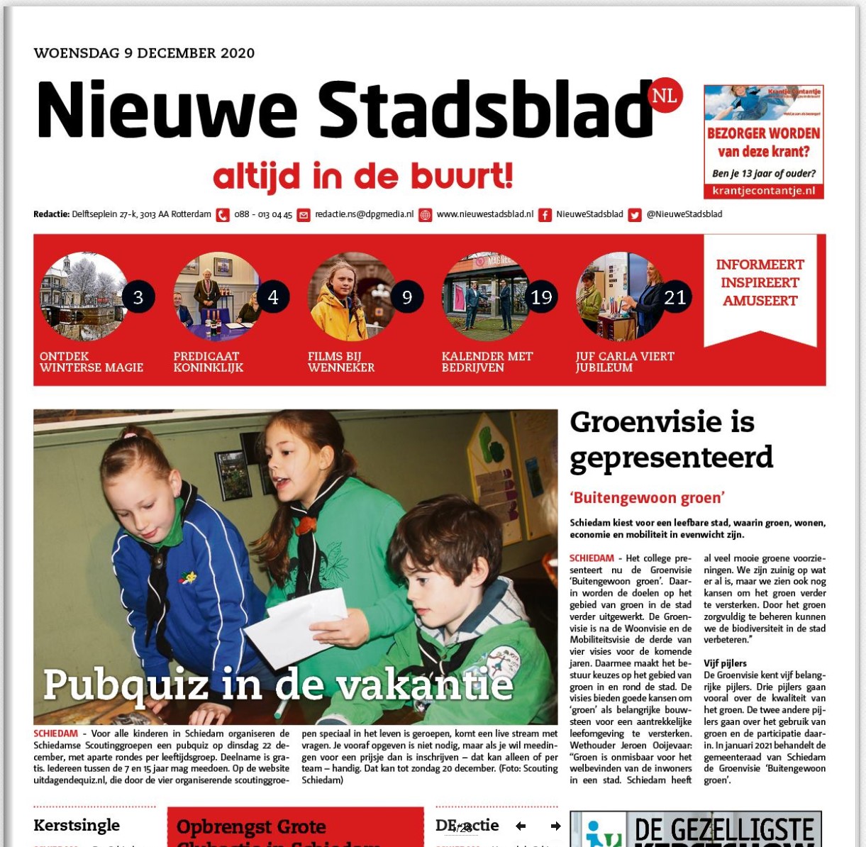Op de voorpagina van het Nieuwe Stadsblad van 9 december 2020 kondigde de krant de pubquiz aan, georganiseerd door de vier Schiedamse Scoutinggroepen.