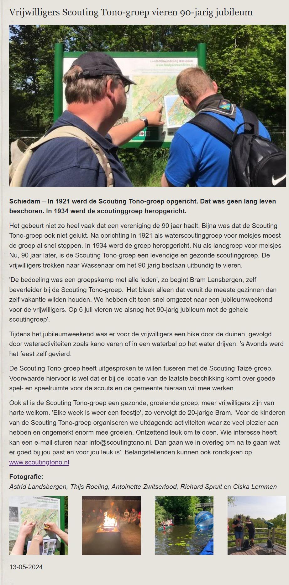 De Schiedammer Online publiceerde op 13 mei 2024 een artikel over het jubileumweekend van de Scouting Tono-groep Schiedam